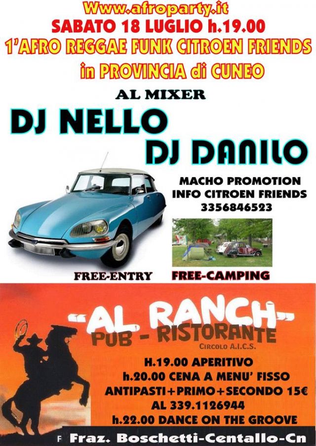1' AFRO REGGAE FUNK CITROEN FRIENDS in PROVINCIA di CUNEO DJ NELLO DJ DANILO SAB 18/7 RANCH PUB Bos