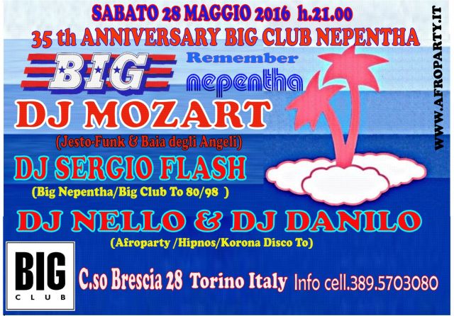 35th ANNIVERSARY BIG CLUB NEPENTHA SABATO 28/5/16 Guest DJ MOZART con DJ.s SERGIO FLASH / NELLO / D