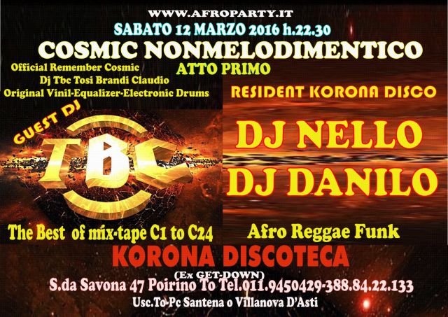 COSMIC NONMELODIMENTICO Sabato 12/3 Guest DJ TBC Tosi-Brandi Claudio Resident DJ NELLO DJ DANILO at