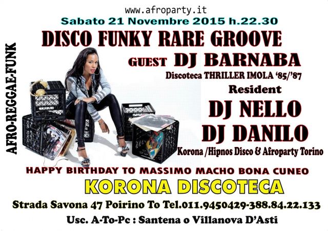 DISCO FUNKY RARE GROOVE Sabato 21/11 Guest DJ BARNABA (THRILLER Imola) Resident DJ NELLO DJ DANILO