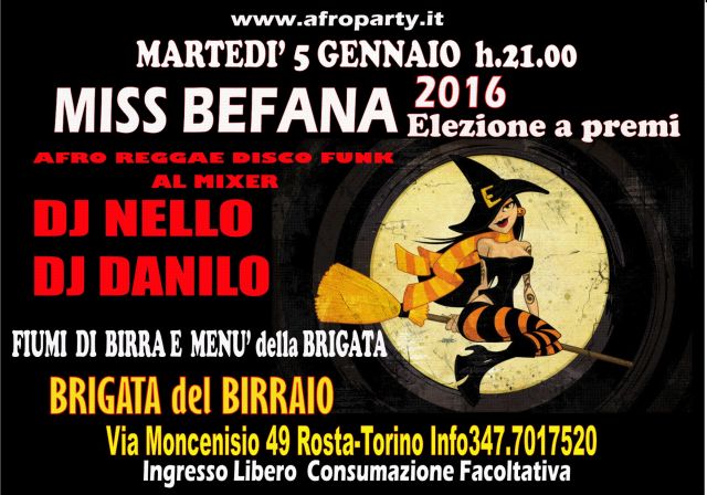 MISS BEFANA 2016 DJ NELLO DJ DANILO DISCO FUNKY AFRO REGGAE Martedì 5 Gennaio BRIGATA BIRRAIO Rosta