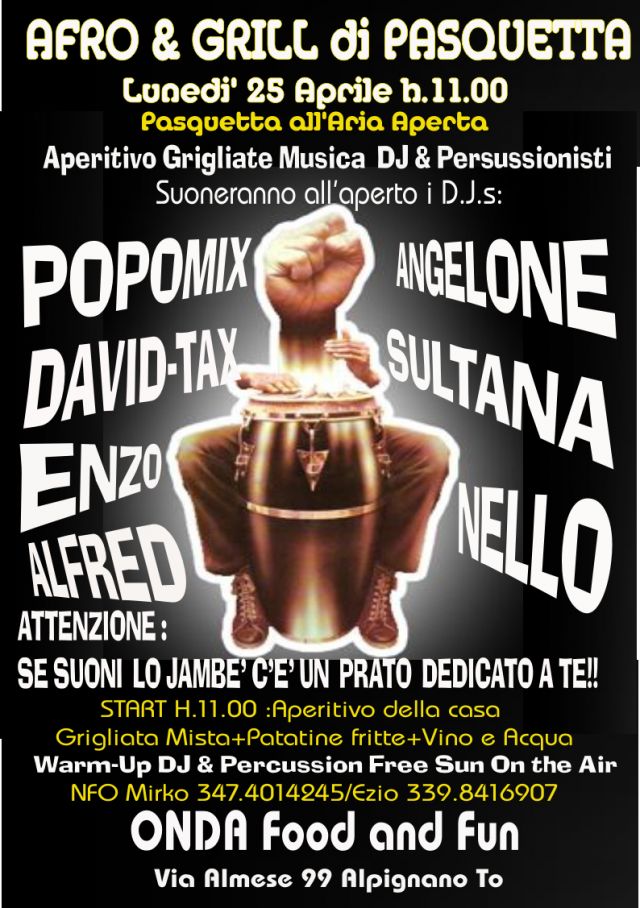 ....quest'anno nell'organizare con gli amici la grigliata di Pasuqetta fuori porta mi son detto ...ma perche' non si combina con la Musica i Dj e i Percussionisti gia dal mattino con aperitivi grigliate vino ecc.ecc. con la possibilita' di poter ballare il tutto all'aria aperta ?...e sapete cosa mi han risposto i miei amici......