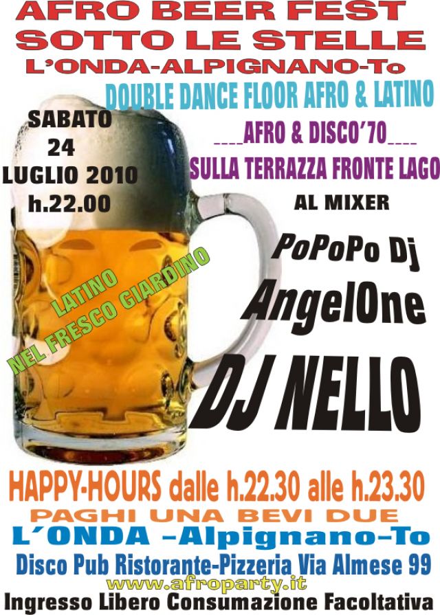 ....continuano le feste Estate 2010 ...il tour dei dj dell'afroparty prosegue nel caldo torrido di una citta' che di giorno si scioglie al sole e di notte si rinfresca all'aperto sotto le stelle sorseggiando boccali di birra ......con al mixer PoPoPo dj AngelOne e Dj Nello Afro Funky Reggae Music alla festa della birra con l'Happy Hours dalle h.22.30 alle h.23.30 paghi una(3.50€) e bevi due .......ragazzi tutti da Gaetano ..una la paghi tu ....l'altra la offre luiiiiiiiiiiiiiiiiii........ti aspetto......