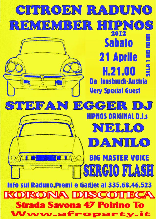.....sensazionale Evento in Italia dopo il primo Citroen Raduno presso la Discoteca Hipnos Torino datato 1990 ,e gli innumerevoli raduni successivi a quella data sparsi per tutta Europa , torna a Torino il DJ Austriaco STEFAN EGGER che con i Resident NELLO & DANILO firmo' il Primo Raduno di 2CV ,DYANE,CX & DS (LO SCUALO) auto d'Epoca che ancor oggi al loro passaggio emozionano sempre piu'!!!!!!