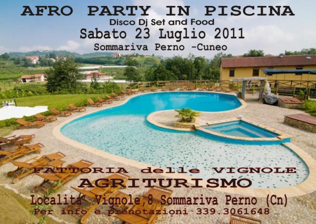 ..........nel fantastico tour Afroparty Sotto le Stelle 2011 un tuffo in piscina per rinfrescare questa calda estate al ritmo di musica Afro Brasil Samba Reggae Funky Disco '70 con i Dj.s ALFRED,ENZO e LELE di Racconigi ....consumare l'aperitivo durante il tramonto,....la cena con specialita' enogastronomiche locali e grigliate ,.......ballare a bordo vasca musica di solo vinile selezionata da DJ NELLO !!!!!!!...