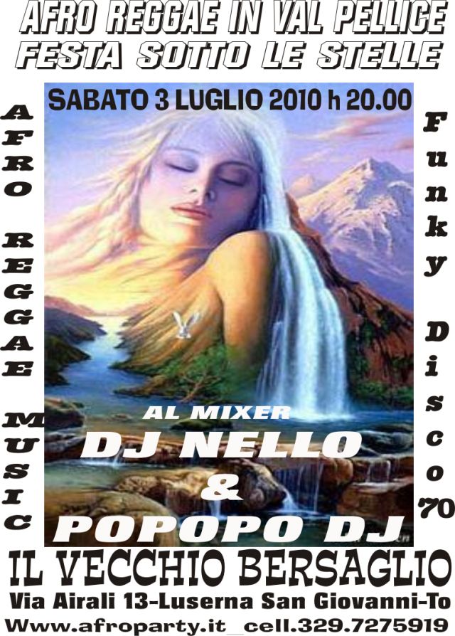 ....con l'AperiCena dalle h.20.00 Sabato 3 Luglio l'Evento Afro Sotto le Stelle da Torino si sposta in Val Pellice e piu' precisamente a Luserna San Giovanni presso Il Vecchio Bersaglio Ristorante Pizzeria di Toto Maria e Enzo ....si potra' ballare all'aperto ai piedi delle montagne ed oltre a poter respirare aria buona.... e' buono ed abbondante anche il menu' preparato da Maria per l'AperyCena.... in alternativa puoi anche ordinare alla carta Pizza Primi e Secondi.....nella speciale cornice della Vallata del fiume Pellice la musica Afro Reggae Funky all'aperto ti fara' ballare Sotto le Stelle con al Mixrer DJ NELLO & POPOPO DJ ...per una notte d'Estate che rimarra' nei nostri cuori.....