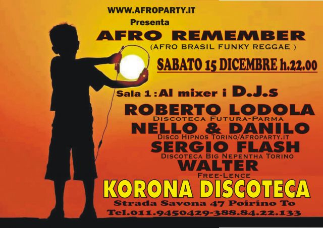 tornano i grandi eventi alla Discoteca Korona di Poirino Sabato 15 Dicembre dalle h.22.00 in SALA 1 AFRO REMEMBER con la musica e i dj degli anni ottanta ospite della serata.... D.J. ROBERTO LODOLA ....resident dell'allora Discoteca Futura di Parma e Mondo Blu , Guest in locali come Melamara.Bisbi.Cotton Club, la musica brasiliana e' uno dei principali cardini della sua carriera senza disdegnare certo il funky - afro che hanno fatto di lui un dj vincente.......Sabato 15 Dicembre un grande ritorno per questa grande occasione alla Discoteca Korona di Poirino .....SERGIO FLASH da Radio Veronica One ...a fare gli onori di casa troveremo D.J. NELLO che ricorda l'indimenticabile serata con Roberto Lodola alla Discoteca Top Sound di Manta di Saluzzo del lontano 1993 .... e non poteva certo mancare il Reggae-Man D.J. DANILO con l' inconfondibile stile Jamaicano.... per la prima volta al Korona DJ WALTER appassionato-cultore e collezionista di vinili prettamente afro .Vi aspettiamo tutti per questa notte afro anni ottanta !!!!!!!!!!!!!!!!!!!!!!!