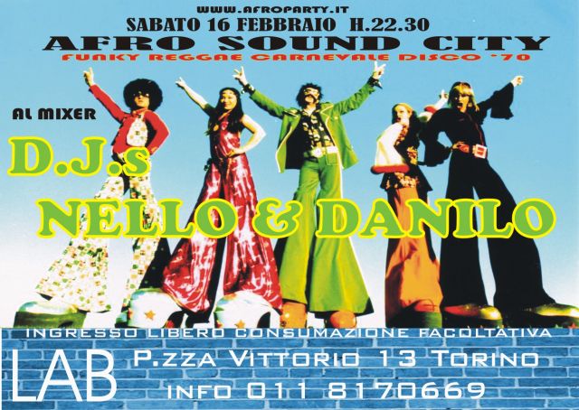 Un Grande ritorno nel Centro cittadino Sabato 16 Febbraio dalle h.22.30 al LAB CLUB Storico locale di P.zza Vittorio dal 2003,e' stato uno dei primi locali serali a rendere Piaz Vittorio il fulcro della Movida torinese. Famoso per la qualità dei suoi cocktails e per l'allestimento dell'aperitivo disposto su due piani ospitera' nella Sala Sotto AFRO SOUND CITY il Centro della Movida Torinese P.zza Vittorio sara' teatro del Carnevale Reggae Disco '70 saranno graditi i travestimenti a tema con al mixer i D.J.s Resident di www.afroparty.it NELLO & DANILO ON THE MIX AFRO FUNKY REGGAE DISCO '70 con Ingresso Libero Consumazione Facoltativa!!!!PASSA PAROLA