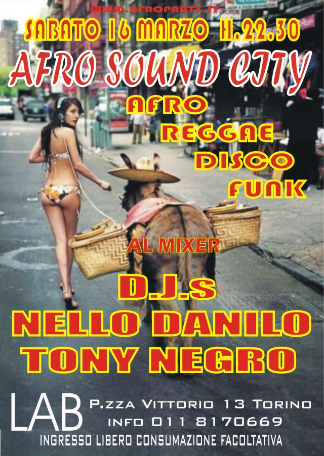 Torna la Musica in centro Sabato 16 Marzo h.22.30 AFRO SOUND CITY aspettando la primavera i suoni e le melodie AFRO REGGAE DISCO FUNK nella Sala Zenith del LAB Club di P.zza Vittorio 13 a Torino uno dei primi locali serali a rendere Piazza Vittorio il fulcro della Movida torinese ottimi cocktails e allestimento d'aperitivo nella Sala Sotto Zenith con i D.J.s NELLO-DANILO-TONY NEGRO l' INGRESSO e' LIBERO la CONSUMAZIONE FACOLTATIVA FATE GIRARE!!!!!!!!
