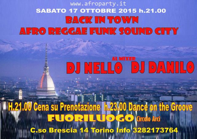 BACK IN TOWN AFRO REGGAE FUNK SOUND CITY SABATO 17/10 DJ NELLO DJ DANILO FUORILUOGO C,so Brescia 14