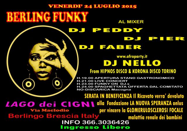 E anche quest'anno non poteva certo mancare l'appuntamento con la solidarità per poter combattere la malattia renale dei bambini la Glomerulosclerosi renale http://www.lanuovasperanza.org/cosa-e-la-sclerosi-focale.php che grazie alla Onlus La Nuova Speranza che raccoglie i fondi per la ricerca ed ad iniziative come ''BERLING FUNKY '' anche noi possiamo renderci utili per questa ricerca partecipando ad iniziative di tale importanza ,infatti i fondi ricavati verranno devoluti all' Onlus La Nuova Speranza come contributo per la ricerca . Nella cornice del Lago dei Cigni di Berlingo la Musica Funky sarà motivo di appartenenza e solidarietà !!!! VI ASPETTIAMO AL CONSUETO APPUNTAMENTO ANNUALE PER COMBATTERE LE MALATTIE RARE DEI BAMBINI