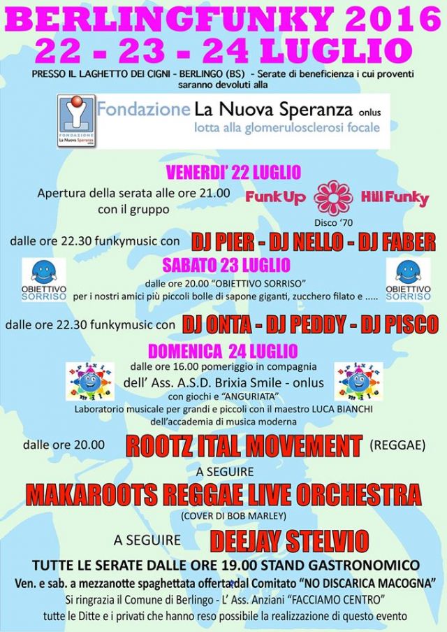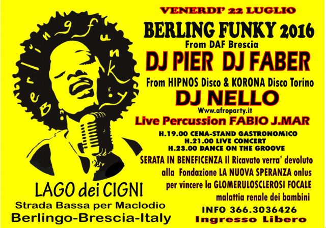 BERLING FUNKY 2016 SI RICONFERMA UN'INIZIATIVA' IMPORTANTE BENEFICA E FONDAMENTALE PER LA RICERCA DELLA GLOMERULOSCLEROSI FOCALE MALATTIA RENALE DEI BAMBINI I FONDI RICAVATI DA QUESTA SERATA VERRANNO DEVOLUTI IN BENEFICENZA alla ONLUS FONDAZIONE LA NUOVA SPERANZA !!!!!GRAZIE AL LAVORO DI EMILIANO MASSIMILIANO E TUTTO LO STAFF DEL BERLING FUNKY QUESTO SARA' POSSIBILE !!!VI INVITO A PARTECIPARE AD UNA COSI' VALIDA INIZIATIVA DI SOLIDARIETA' DOVE LA MUSICA FUNKY le SPECIALITA' ENOGASTRONOMICHE LOCALI E LA BENEFICENZA PRO SALUTE DEI BAMBINI SI UNISCO IN UN SOLO CORPO !!!!
