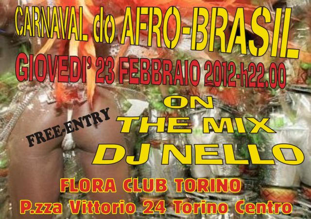 ....il giovedi' del Flora anche quest'anno non perde l'occasione per proporre lo Special Afro-Brasil di chiusura del Carnevale 2012 e Premi per i piu' mascherati ..impeccabilmente le proposte sonore saranno dirette da D.J. NELLO che sui piatti fara' girare le chicche DO AFRO BRASIL e non solo ..il programma sara' preceduto dall'Intro Funky Disco Doc che di certo non puo' mancare ....VI BACIO VI ABBRACCIO e VI ASPETTO GIOVEDI' al FLORA CLUB TORINO!!!!!!