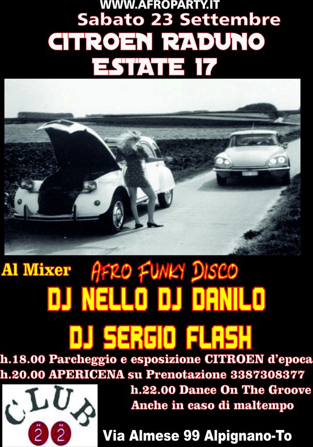 Torna la mitica serata che ogni anno dal 1990 (Discoteca HIPNOS)si materializza sempre in un posto diverso CITROEN RADUNO quest'anno in quel di Alpignano-To CLUB 22 Sabato 23 Settembre le protagoniste LORO le storiche ammiraglie Citroen DS/ID (Lo Squalo),CX,SM,2CV,DYANE,AMY 6/8,MEHARI e derivate che ci hanno scorrazzato in lungo e in largo per anni e anni e che ancor oggi fanno godere i loro propietari di un prestigio unico e inconfondibile ,VOI che di certo non vi perdere l'ultima serata in programma dell'ESTATE 17 in questo cosi bel posto immerso nel verde del CLUB 22 con pista all'aperto con possibilità di pista al chiuso in caso di mal tempo,NOI DJ.s SERGIO FLASH NELLO DANILO che con l'inconfondibile sound Afro Reggae Funky rinfrescheremo questa calda Estate nell'appuntamento di chiusura estiva