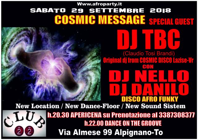 Cosmic Message Guest DJ TBC Sab 29/9 CLUB 22 Alpignano-To