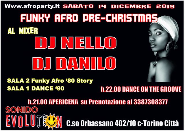 Funky Afro Pre-Christmas Sab 14/12 DJ Nello DJ Danilo Sonido To