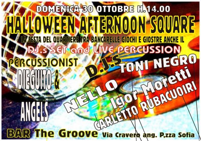 ..la festa di quartiere nel pomeriggio di domenica 30 ottobre tra bancarelle giostre e giochi anche i DJ.s e Percussionisti al BAR da Ciccio ...THE GROOVE BAR.....dalle h.14.00 con i DJ.s TONI NEGRO, IGOR MORETTI ,CARLETTO RUBACUORI & DJ NELLO alle percussioni troveremo DIEGUITO & ANGELS per il pomeriggio con Halloween in Piazza......non perderti l'occasione di fare shopping con la grande musica AFRO FUNKY DISCO...TI ASPETTO!!!!!!