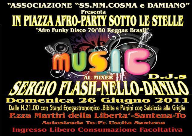 ...nel tour dell'Afroparty Estate 2011 Domenica 26 Giugno dalle h.20.00 stazioneremo nella piazza centrale di Santena resa disponibile per l'occasione dall'associazione "SS.MM.COSMA & DAMIANO" che ringraziamo per la cordialita' e disponibilita' nel svolgere questo evento aperto al pubblico con Ingresso Libero e Consumazione Facoltativa .......