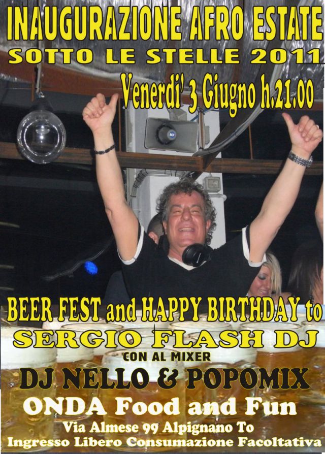.....inizia l'Estate Afro Reggae Funky Disco 2011 Sotto le Stelle direttamente nel locale in cui negli scorsi anni le feste d'estate si sono consumate sulla terrazza in riva al lago con fiumi di Birra, Pizza a volonta' e ottima musica Afro Funky Reggae Disco '70...con la FESTA della BIRRA... Venerdi' 3 Giugno all h.21.00 ad iniziare le danze estive sara' colui che dagli anni settanta in Voce ed in Musica e' presente nelle Discoteche e alla Radio con la grande musica Disco Afro Funky ...SERGIO FLASH con il suo Compleanno !!!!!!!!!!!a cui rivolgiamo un grazie speciale per aver dato modo ai grandi locali del Piemonte di promuovere e programmare la ''THE BIG MUSIC ''da sempre ,ed un Augurio di Cuore per Cento di questi Giorni!!!!!!!!!!