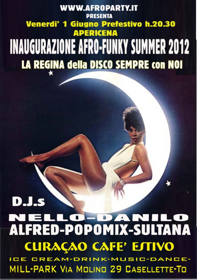 ....partono le serate estive sul territorio piemontese VENERDI' 1 GIUGNO PREFESTIVO con l'APERICENA ad inaugurarle sara' l'Estivo della discoteca Curaçao che si trasformera' in Curaçao Caffe' e si trasportera' a Casellette in provincia di Torino immersa in una splendida location dal nome MILL PARK ,il prato inglese ospitera' ombrelloni e sdraio per gli Apericena , il palchetto coperto la pista da ballo per le sfrenate danze ,il bel porticato la consolle con tutto l'impianto per far suonare i D.J.s & Percussionisti del circuto AFRO FUNKY TORINO che vedra' al mixer dallApericena in poi ALFRED-POPOMIX-SULTANA-DANILO & NELLO D.J.s e alle Percussioni il leggendario EMANUEL MILLER Jamaicano dalle capacita' induscusse,sullo sfondo il laghetto con un panorama estremamente coinvolgente che non guasta mai!!!!