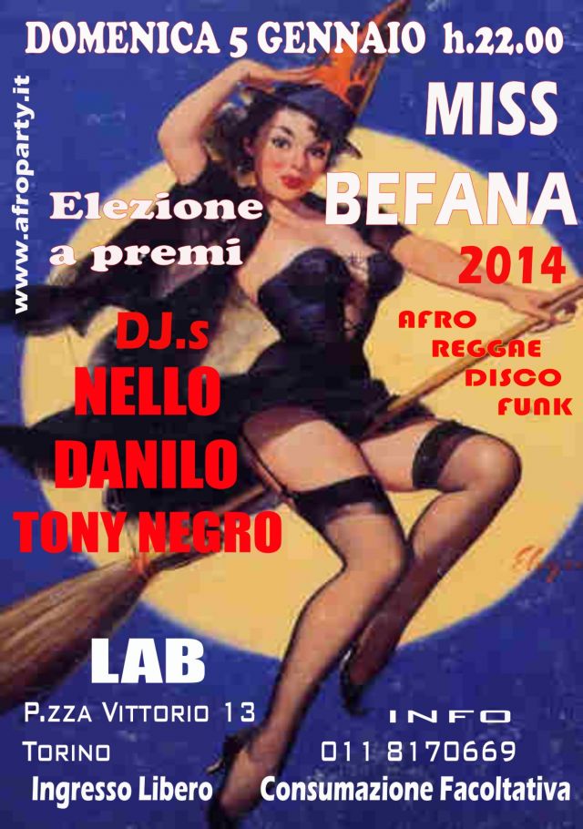 Prima serata targata 2014 Domenica 5 Gennaio dalle h.22.30 LAB CLUB P.zza Vittorio 13 Torino direttamente dal centro cittadino la 1' serata dell'anno MUSICA 2014 AFRO REGGAE DISCO FUNK festeggeremo ed eleggeremo MISS BEFANA 2014 con ricchi premi e cotillon in pista voi tutte Sexy Befane al mixer i DJ NELLO / DJ DANILO / DJ TONY NEGRO VI ASPETTANO con INGRESSO LIBERO CONSUMAZIONE FACOLTATIVA