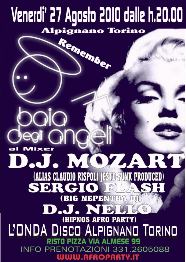.....dalle h.20.00 con l'aperitivo nel giardino i Dj dell'Afroparty Danilo,AngelOne,PoPoPo,Sultana e i percussionisti Emanuel Miller & Angel P. daranno inizio a questa fantastica serata che si potrarra' fino all'alba con la colazione ....nell'arco di questa NOTTE degli ANGELI con Dj Nello e Sergio Flash ...il Remember firmato Dj Mozart prevede una performance che fara' totalmente sognare chi ha vissuto la musica della BAIA degli... ANGELI e sicuramente ballare chi invece ne ha sempre sentito parlare ...non che godere tutti coloro che hanno sempre definito DJ MOZART IL MAESTRO per il suo estro per la sua imprevedibilita' non che' per la sua storia essendo lui il primo Dj in Italia ad adottare negli anni '70 le tecniche di mixaggio che ancor oggi risultano vincenti ....quindi... appuntamento a Venerdi' 27 Agosto__ L'ONDA DISCO Via Almese 99 Alpignano Torino
