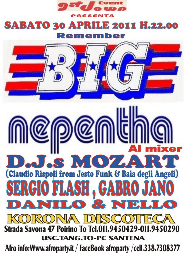 ......dopo il primo evento del Remember Get Down ed il secondo dedicato al Cosmic con Dj Tbc, la Discoteca Korona e' lieta di celebrare il BIG NEPENTHA leggendario locale inaugurato nel 1980 dall'allora Dj della Baia degli Angeli,Claudio Rispoli in arte DJ MOZART....il 30 Aprile a distanza di 30 anni rievocheremo la serata inaugurale che regalo' alla citta' di Torino e a tutta Europa uno dei Club piu' all'avanguardia di tutti i tempi......con DJ MOZART ripercorreremo insieme tutte le tappe sonore di quelle fantastiche serate che animavano le notti Torinesi ....presenziera' la serata il Dj che da quellq Inaugurazione divenne per 17 anni il RESIDENT del BIG.....SERGIO FLASH .....con i DJ.s MOZART e SERGIO FLASH il 30 Aprile al mixer troveremo DJ NELLO Resident agli Afroparty Events dalla fine degli anni ottanta con leggendarie serate .....emozioni in Musica che solo una festa AFRO puo dare .........,DJ DANILO cultore della musica Reggae e Funky ed attivo Disc Jokey all'Afroparty.......,GABRO JANO rivelazione non che proposta della serata ...........!!!!!