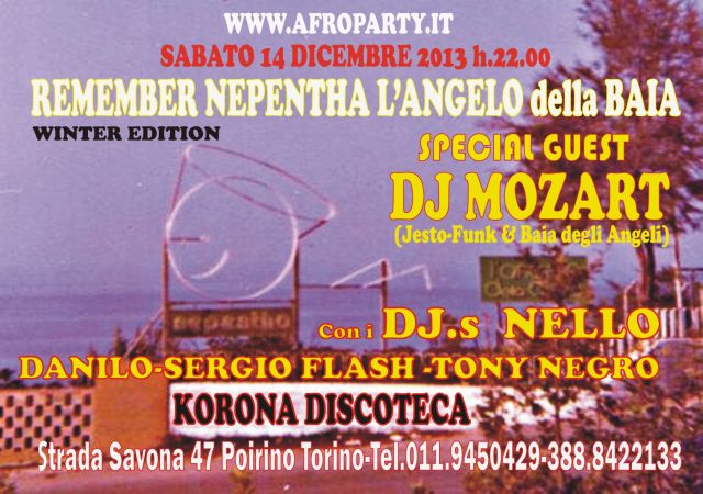 Torna la musica dell'Angelo in THE WINTER EDITION dopo il successo di quest'estate nonostante il temporale celebreremo per chi c'era e per chi non e' riuscito ad esserci ''NEPENTHA L'ANGELO della BAIA ' Discoteca di Gabicce Monte-Mare che tra il '79 e l'80 gestito dal celebre titolare Torinese che come gli altri due clubs della citta', diede lo stesso magico nome ,per l'occasione il GUEST della serata sara' il Resident di quegli anni alla BAIA degli ANGELI,presente agli Afroparty invernali ,non che Leeder dei JESTOFUNK... DJ MOZART !!!Il microfono verra' affidato alle mani e alla voce della radio Piemontese in qualita' di Speaker e DJ di RADIO VERONICA ONE FM 93.7... DJ SERGIO FLASH Resident in quegli anni al Nepentha Discoteca di Via Le Chiuse Torino... !!!!!Con loro al mixer sentirete suonare i dischi del : DJ e Promotore dei Grandi Eventi e Resident alle itineranti serate www.Afroparty.it Disc Jockey da meta' degli anni ottanta ...DJ NELLO !!!! del DJ cultore della musica Rasta in Piemonte non che' Resident all'HIPNOS DISCO TORINO ...DJ DANILO !!!!!del DJ amatore del solco del Vinile non che' collezionista e Freelance ...DJ TONY NEGRO !!!