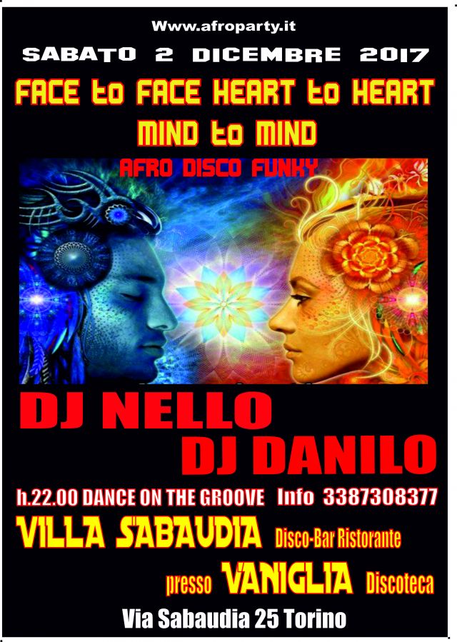 Sab 2/12 FACE to FACE HEART to HEART MIND to MIND DJ Nello DJ Danilo VILLA SABAUDIA c/o VANIGLIA To