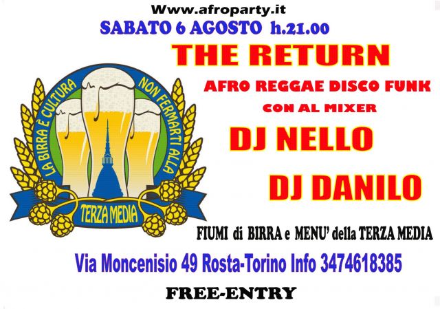 The Return AFRO Reggae DISCO Funk DJ Nello DJ Danilo Sabato 6/8 TERZA MEDIA Disco Pub Rosta-Torino